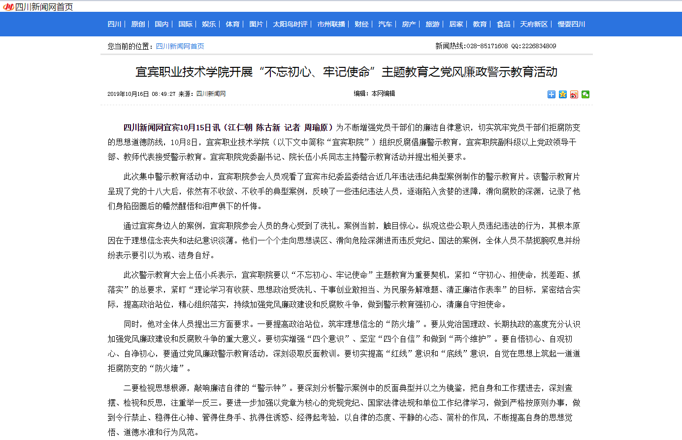 宜宾职业技术学院开展“不忘初心、牢记使命”主题教育之党风廉政警示教育活动(四川新闻网)