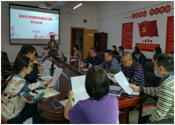 徐奇霖书记带领大家学习了《关于加强和改进新时代师德师风建设的意见》、《新时代高校教师职业行为十项准则》、《宜宾职业技术学院教师行为规范“十二条”》以及《新时代师德师风建设工作方案》,明确提出全院教师应树立“育人为本、德育为先”的教育理念,弘扬师德、端正师风,争做“四有好教师”的工作要求。希望大家对照“四有好老师”的标准和“四个引路人”的指示,树立正确的教育观、质量观及人才观,自觉增强教书育人、以身立教的责任感和使命感,切实提高自身思想政治素质和职业道德水平。