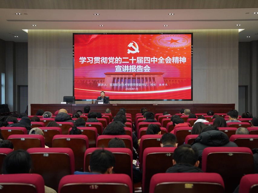 为深入学习宣传贯彻党的二十届四中全会精神,引导广大师生准确把握全会核心要义与实践要求,2026年1月8日,宜宾职业技术学院举办专题宣讲会。学校党委副书记、校长张学尽以 “在接续奋斗中谱写中国式现代化新篇章 —— 深入学习贯彻党的二十届四中全会精神” 为题作宣讲报告,建筑与环境工程学院书记温燕萌主持会议,素质教育学院、建筑与环境工程学院75名教师现场聆听。