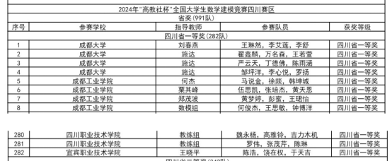 近日,2024年“高教社杯”全国大学生数学建模竞赛四川赛区组委会评审结果公示工作结束。我校共9支队伍参赛,6支队伍获奖,其中,获专科组省一等奖1项,省二等奖2项,省三等奖3项,在获奖等级和获奖数量上取得突破性成果。